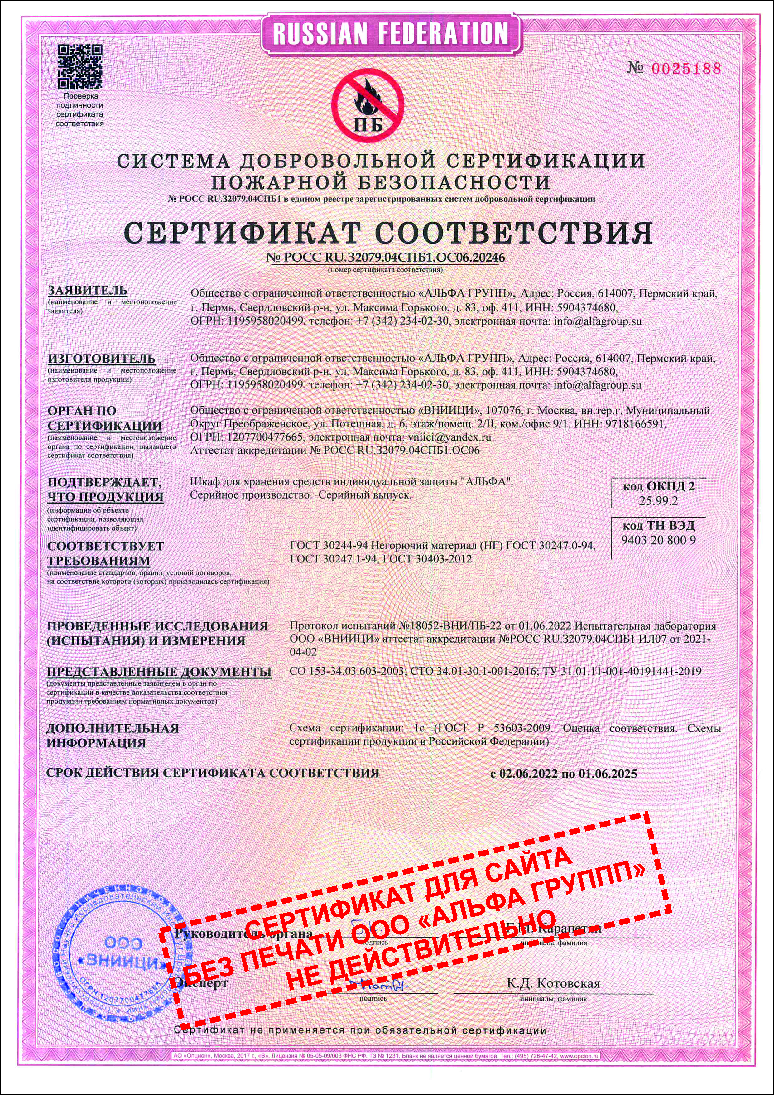 Сертификат на шкаф АЛЬФА